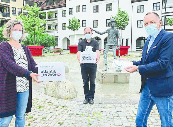 At the market place in Planegg, Ottmar Flach (CEO of Atlantik Networxx AG (right) handed over the boxes with the masks to Veronika Wagner (VHS) and Thomas Schaffert (Music School Planegg-Krailling).